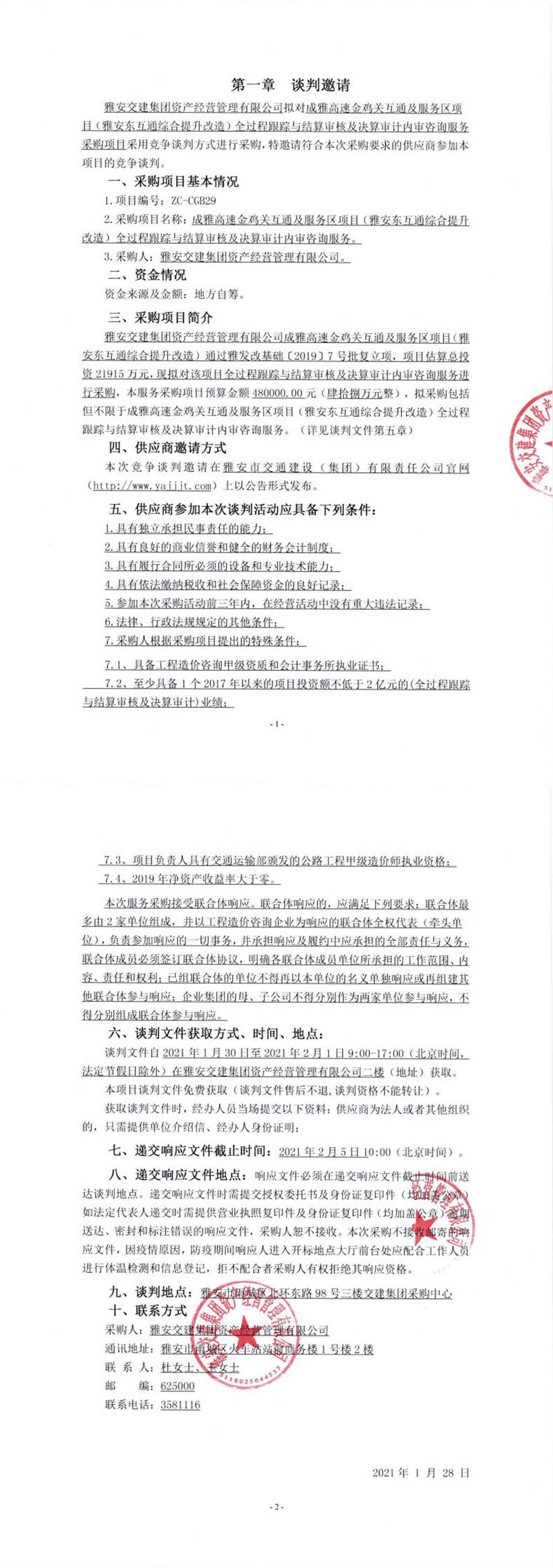 雅安交建集團資產(chǎn)經(jīng)營管理有限公司成雅高速金雞關(guān)互通及服務(wù)區(qū)項目(雅安東互通綜合提升改造)全過程跟蹤與結(jié)算審核及決算審計內(nèi)審咨詢服務(wù)談判公告