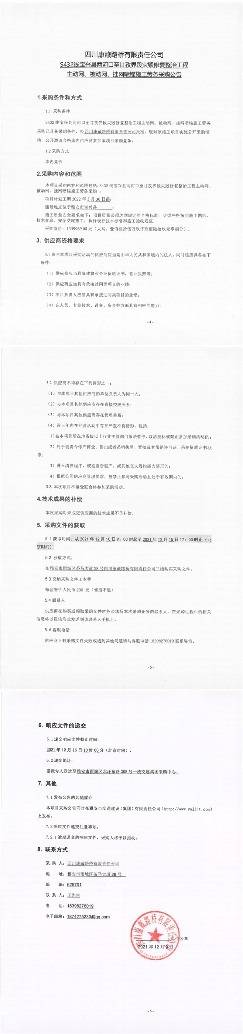 四川康藏路橋有限責(zé)任公司S432線寶興縣兩河口至甘孜界段災(zāi)毀修復(fù)整治工程主動(dòng)網(wǎng)、被動(dòng)網(wǎng)、掛網(wǎng)噴錨施工勞務(wù)采購(gòu)公告