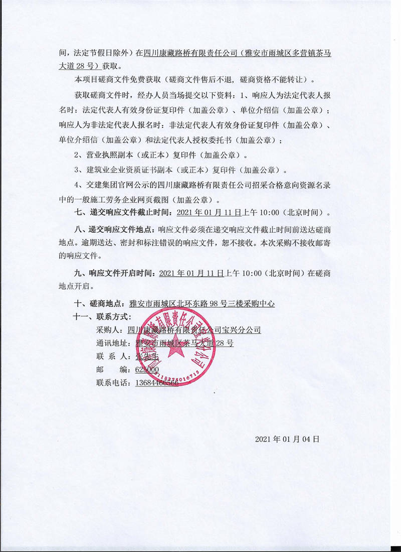 四川康藏路橋有限責(zé)任公司寶興分公司省道432線雅安段擴(kuò)建工程K19新建拌合站施工勞務(wù)磋商公告