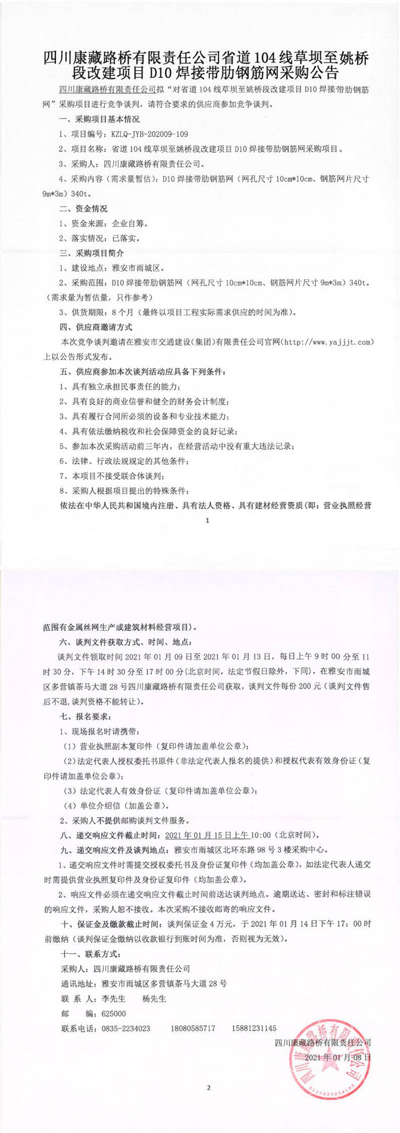 四川康藏路橋有限責(zé)任公司省道104線草壩至姚橋段改建項(xiàng)目D10焊接帶肋鋼筋網(wǎng)采購公告