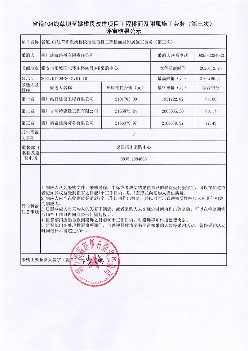 四川康藏路橋有限責任公司省道104線草壩至姚橋段改建項目工程橋面及附屬施工勞務(第三次)評審結果公示