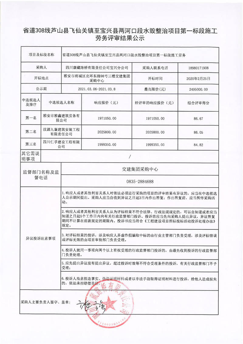 四川康藏路橋有限責(zé)任公司寶興分公司省道308線蘆山縣飛仙關(guān)鎮(zhèn)至寶興縣兩河口段水毀整治項目第一標段施工勞務(wù)評審結(jié)果公示