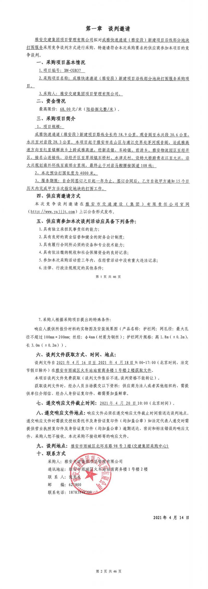 雅安交建集團(tuán)項(xiàng)目管理有限公司成雅快速通道(雅安段)新建項(xiàng)目沿線(xiàn)部分地塊打圍服務(wù)采購(gòu)項(xiàng)目競(jìng)爭(zhēng)談判公告