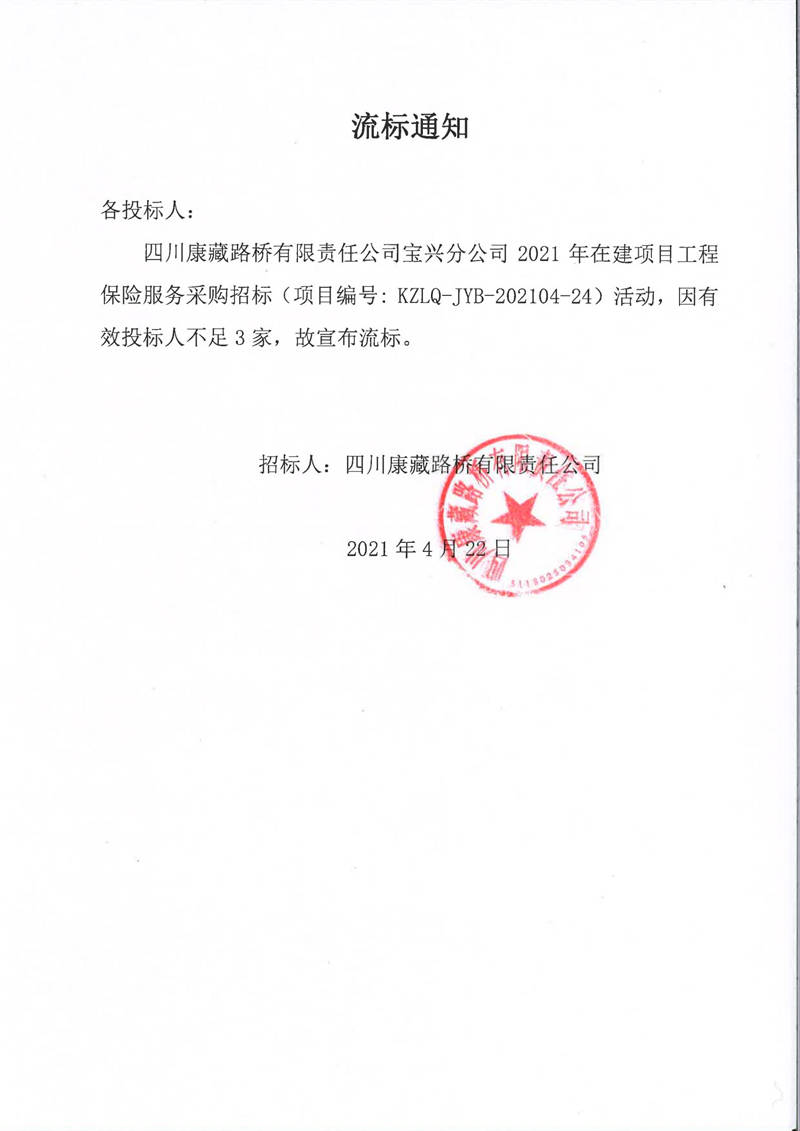 四川康藏路橋有限責(zé)任公司寶興分公司2021年在建項(xiàng)目工程保險(xiǎn)服務(wù)采購流標(biāo)通知
