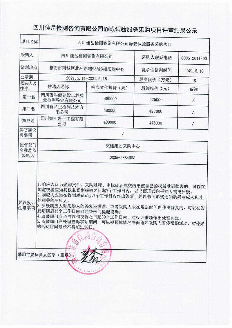 四川佳岳檢測(cè)咨詢有限公司靜載試驗(yàn)服務(wù)采購項(xiàng)目評(píng)審結(jié)果公示