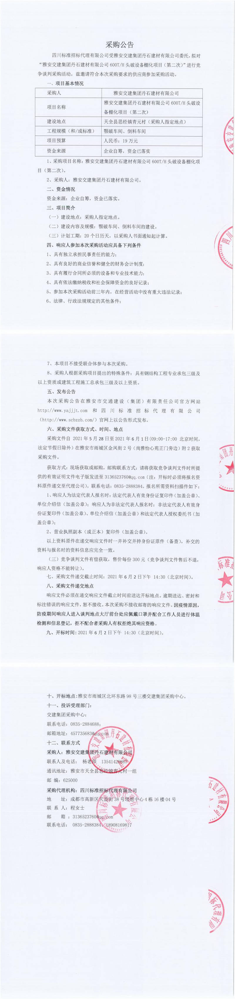 雅安交建集團丹石建材有限公司600T/H頭破設備棚化項目(第二次)競爭談判公告