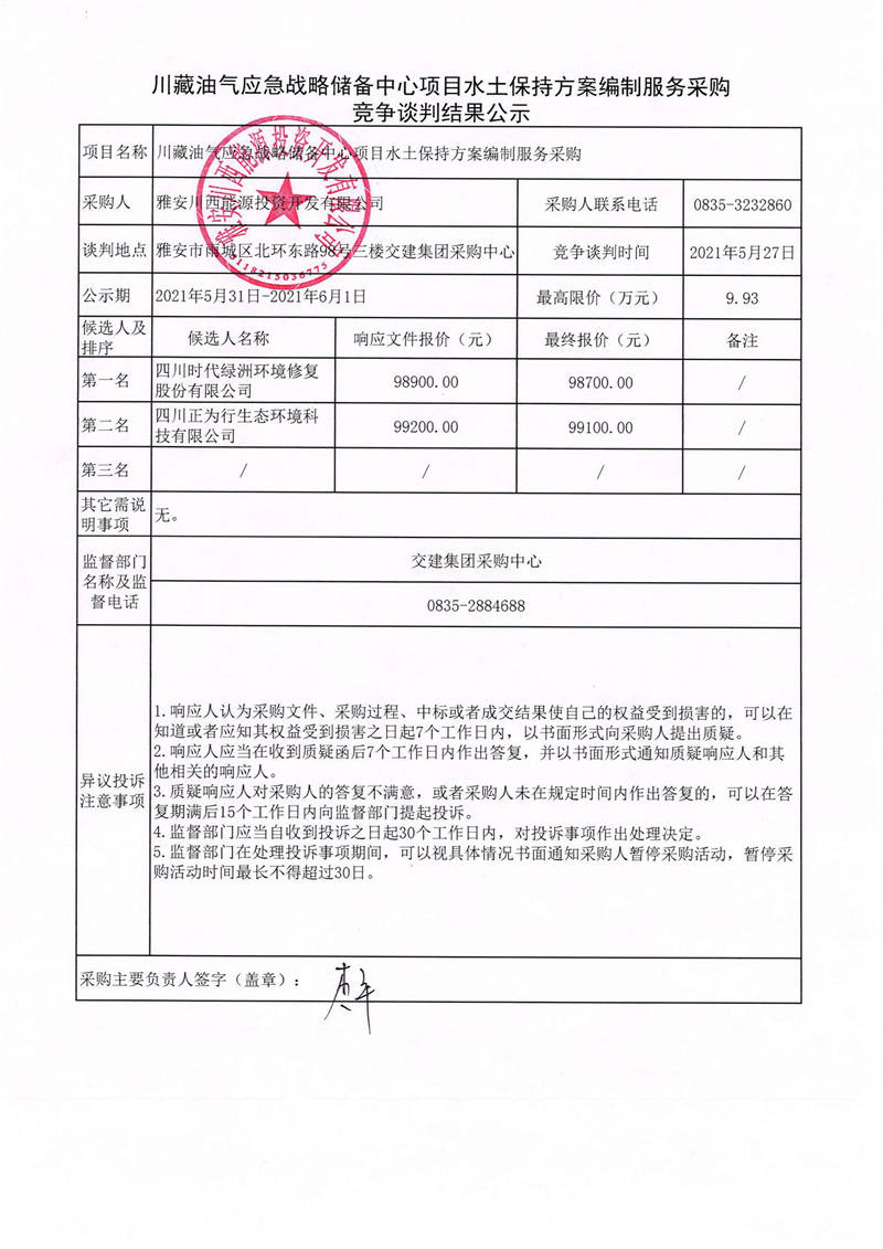 雅安川西能源投資開發(fā)有限公司川藏油氣應急戰(zhàn)略儲備中心項目水土保持方案編制服務采購競爭談判結果公示