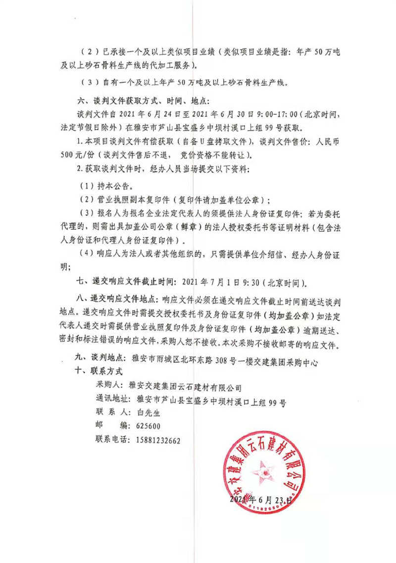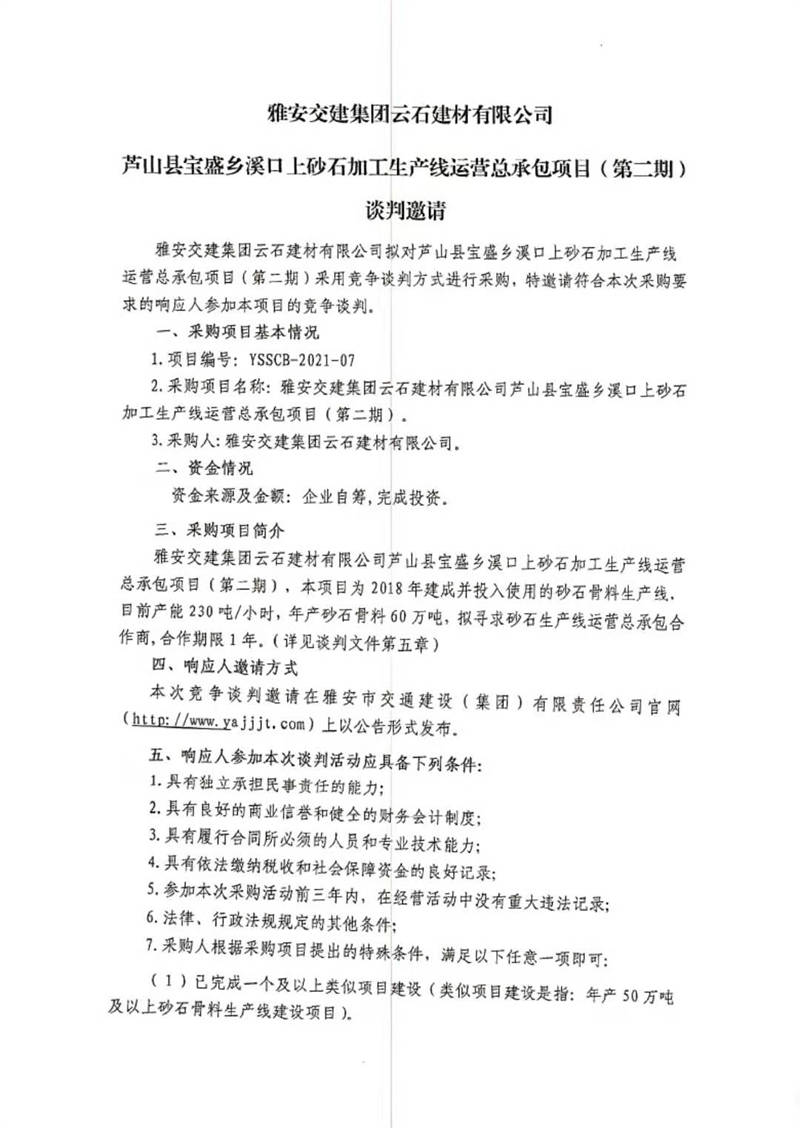 雅安交建集團(tuán)云石建材有限公司蘆山縣寶盛鄉(xiāng)溪口上砂石加工生產(chǎn)線運(yùn)營(yíng)總承包項(xiàng)目(第二期)競(jìng)爭(zhēng)談判公告