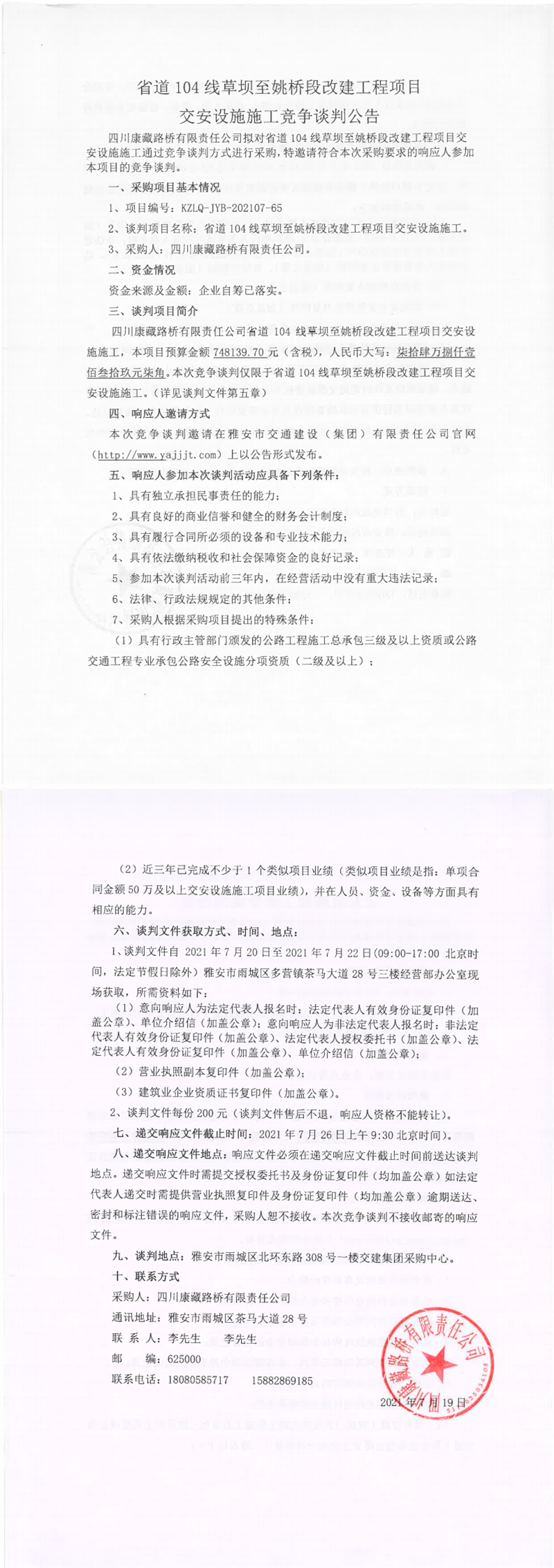 四川康藏路橋有限責(zé)任公司省道104線(xiàn)草壩至姚橋段改建項(xiàng)目交安設(shè)施施工競(jìng)爭(zhēng)談判公告