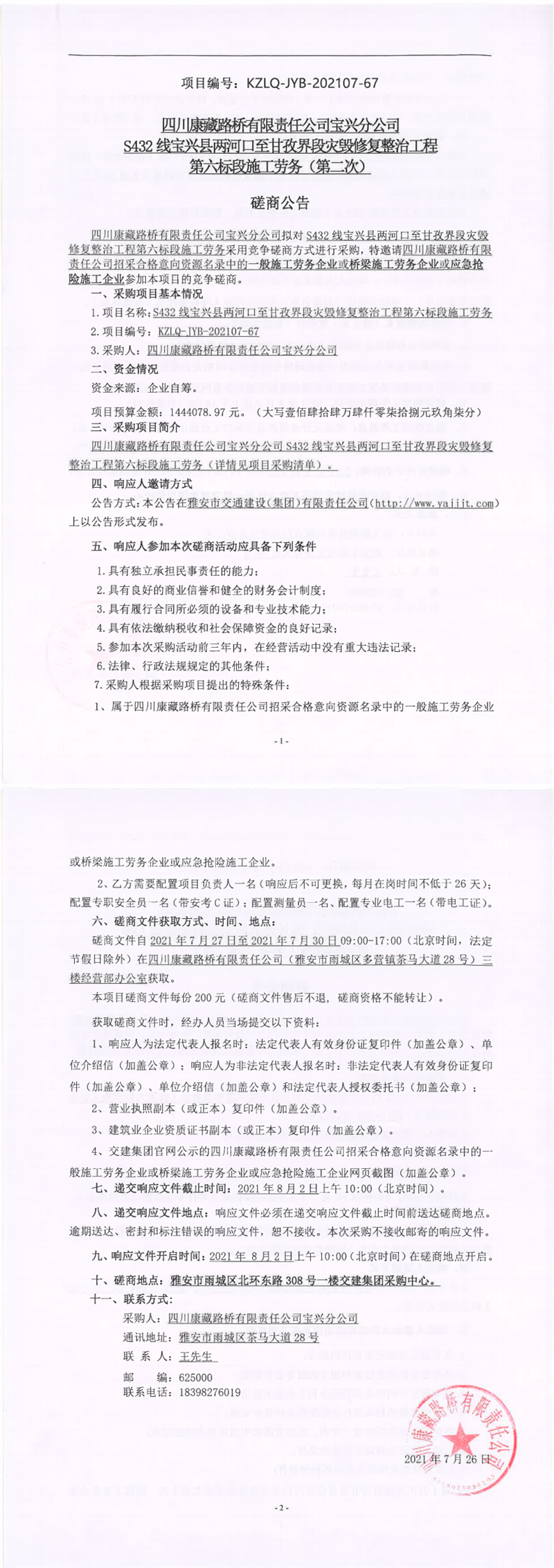 四川康藏路橋有限責(zé)任公司S432線寶興縣兩河口至甘孜界段災(zāi)毀修復(fù)整治工程第六標(biāo)段施工勞務(wù)(第二次)競爭磋商公告