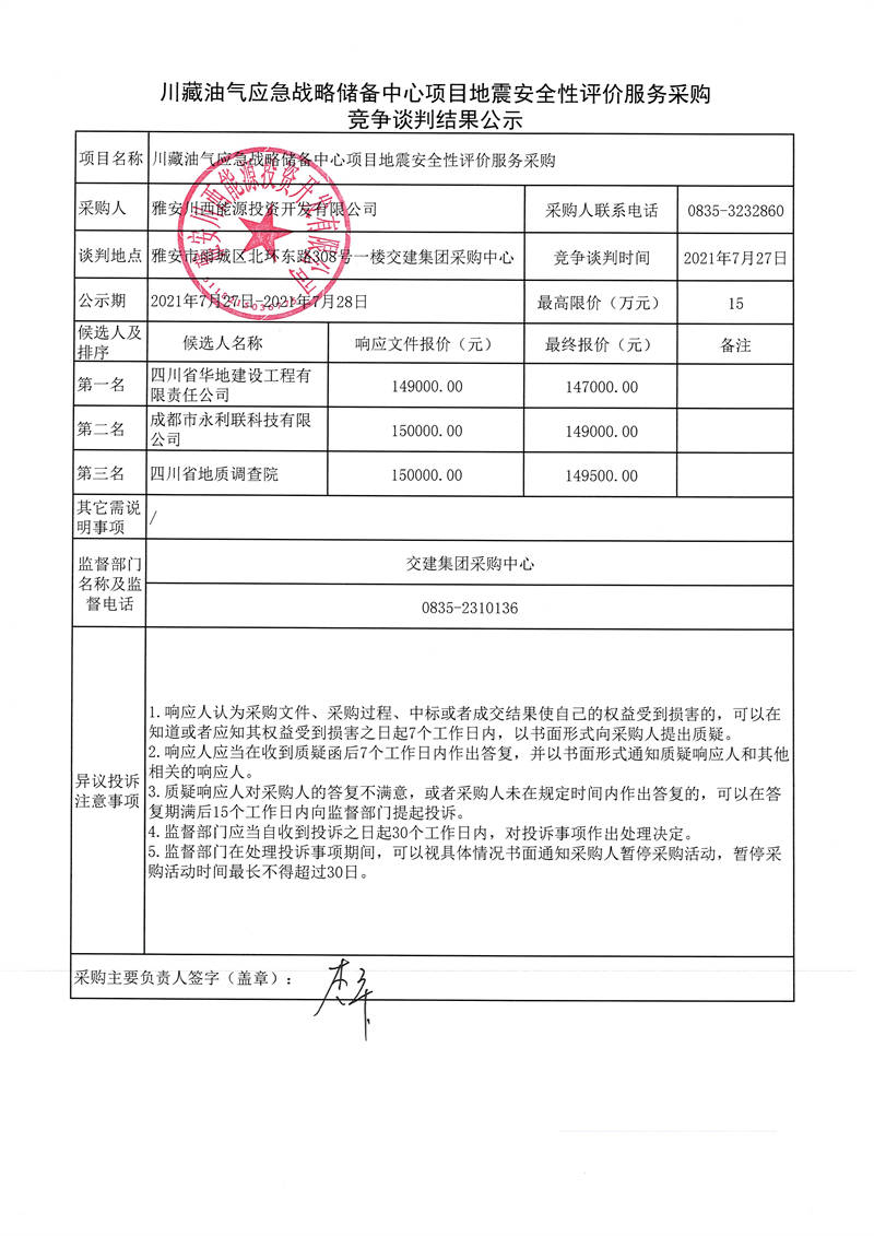 雅安川西能源投資開發(fā)有限公司川藏油氣應(yīng)急戰(zhàn)略儲備中心項(xiàng)目地震安全性評價(jià)服務(wù)采購競爭談判結(jié)果公示
