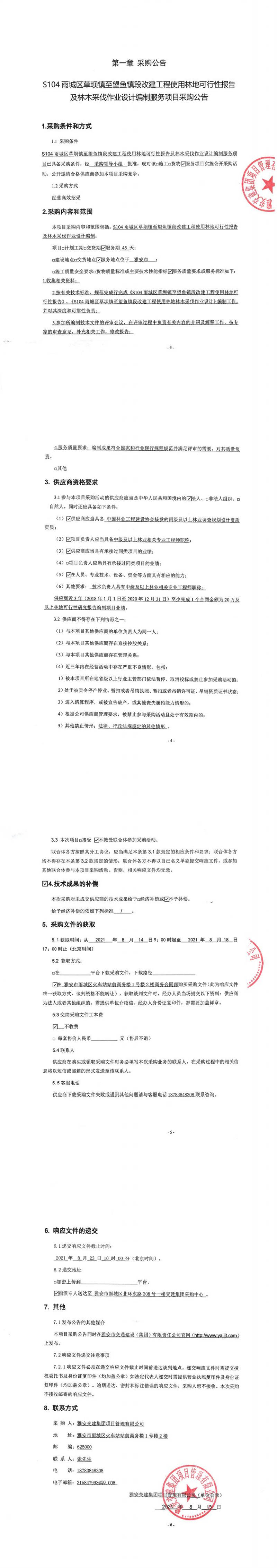 雅安交建集團項目管理有限公司S104雨城區(qū)草壩鎮(zhèn)至望魚鎮(zhèn)段改建工程使用林地可行性報告及林木采伐作業(yè)設(shè)計編制服務(wù)項目采購公告