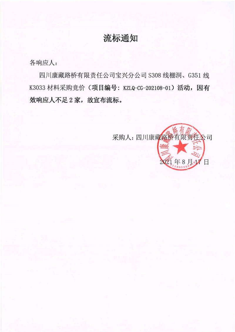 四川康藏路橋有限責(zé)任公司寶興分公司S308線(xiàn)棚洞、G351線(xiàn)K3033材料采購(gòu)競(jìng)價(jià)流標(biāo)通知