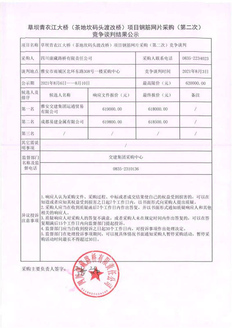四川康藏路橋有限責任公司草壩青衣江(茶地坎碼頭渡改橋)項目鋼筋片采購競爭談判結果公示