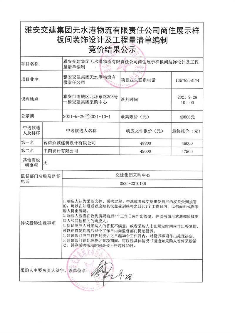 雅安交建集團(tuán)無水港物流有限責(zé)任公司商住展示樣板間裝飾設(shè)計(jì)及工程量清單編制競價(jià)結(jié)果公示