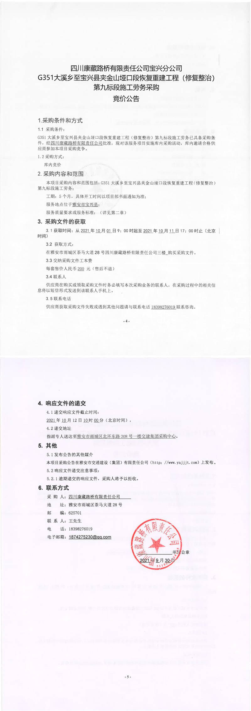四川康藏路橋有限責任公司寶興分公司G351大溪鄉(xiāng)至寶興縣夾金山埡口段恢復重建工程(修復整治)第九標段施工勞務采購競價公告