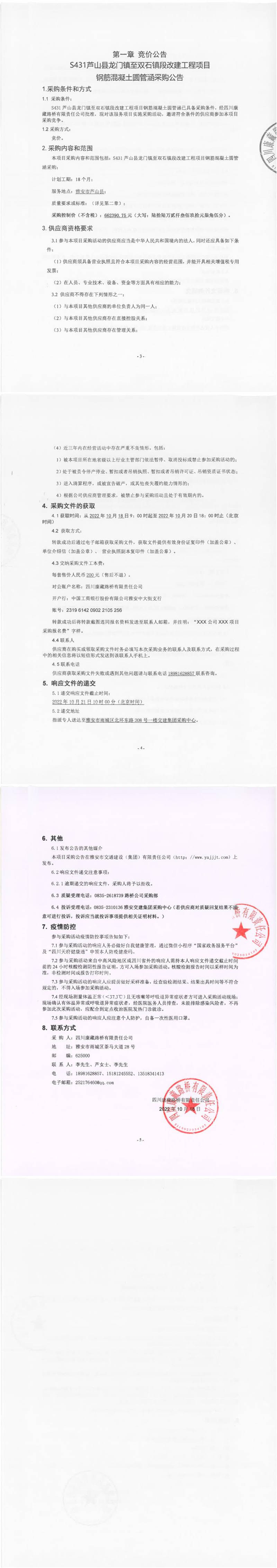 四川康藏路橋有限責任公司S431蘆山縣龍門鎮(zhèn)至雙石鎮(zhèn)段改建工程項目鋼筋混凝土圓管涵采購公告