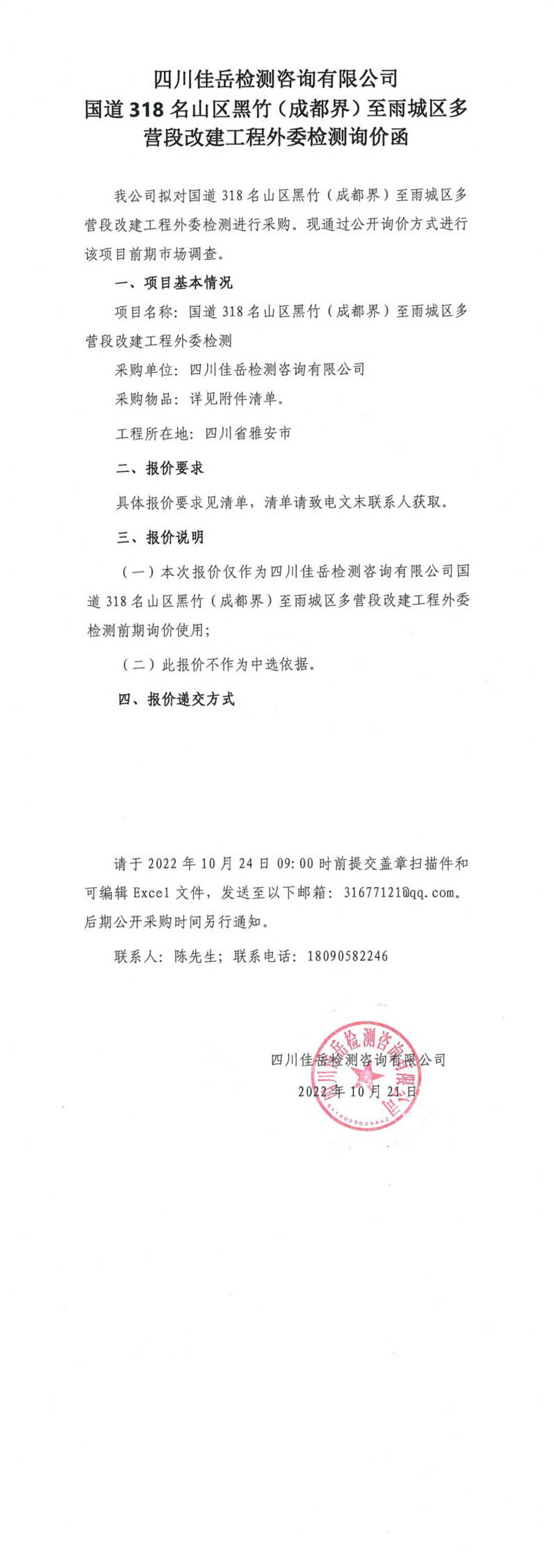 四川佳岳檢測(cè)咨詢有限公司國道318名山區(qū)黑竹(成都界)至雨城區(qū)多營段改建工程外委檢測(cè)詢價(jià)函