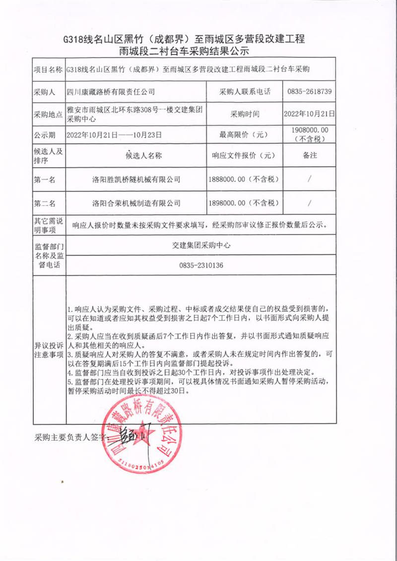 四川康藏路橋有限責(zé)任公司G318線名山區(qū)黑竹(成都界)至雨城區(qū)多營(yíng)段改建工程雨城段二襯臺(tái)車采購(gòu)結(jié)果公示
