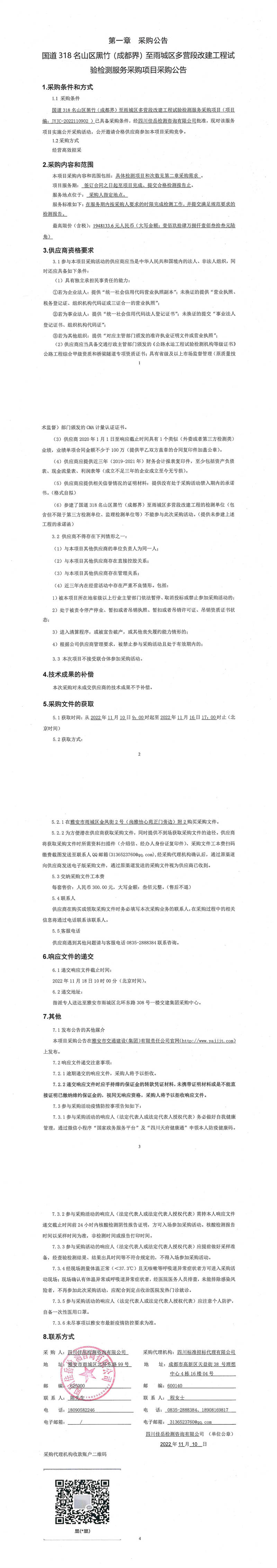 四川佳岳檢測咨詢有限公司國道318名山區(qū)黑竹(成都界)至雨城區(qū)多營段改建工程試驗(yàn)檢測服務(wù)采購項(xiàng)目采購公告