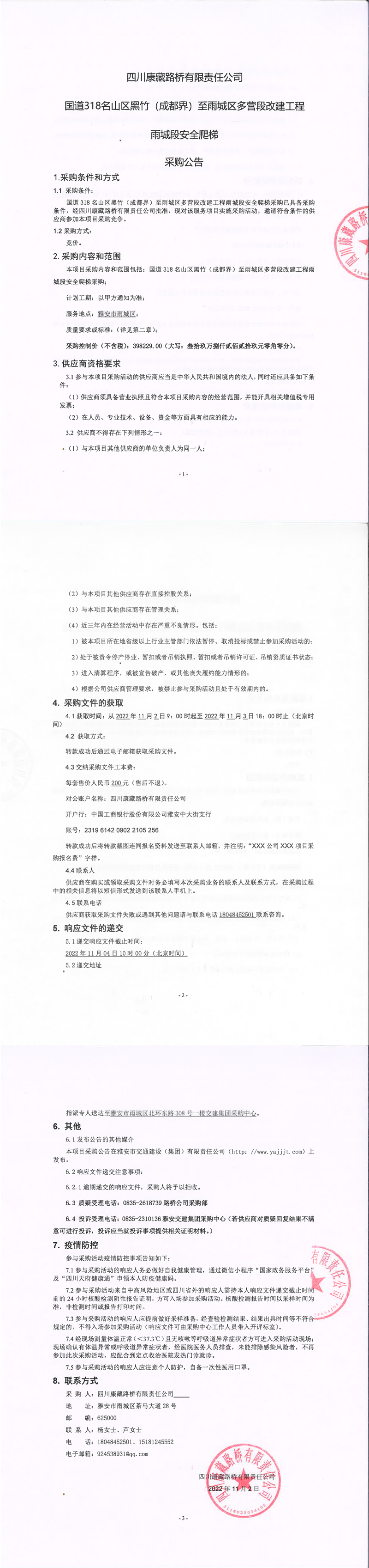 四川康藏路橋有限責任公司國道318名山區(qū)黑竹(成都界)至雨城區(qū)多營段改建工程雨城段安全爬梯采購公告