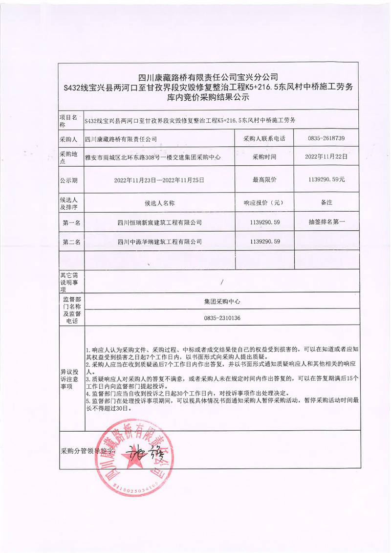 四川康藏路橋有限責(zé)任公司寶興分公司S432線寶興縣兩河口至甘孜界段災(zāi)毀修復(fù)整治工程K5+216.5東風(fēng)村中橋施工勞務(wù)庫內(nèi)競價(jià)采購結(jié)果公示