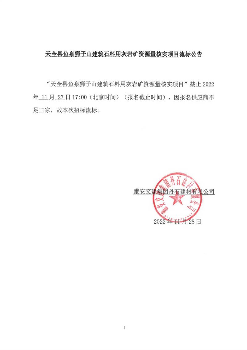 雅安交建集團(tuán)丹石建材有限公司天全縣魚泉獅子山建筑石料用灰?guī)r礦資源量核實(shí)項(xiàng)目流標(biāo)公告