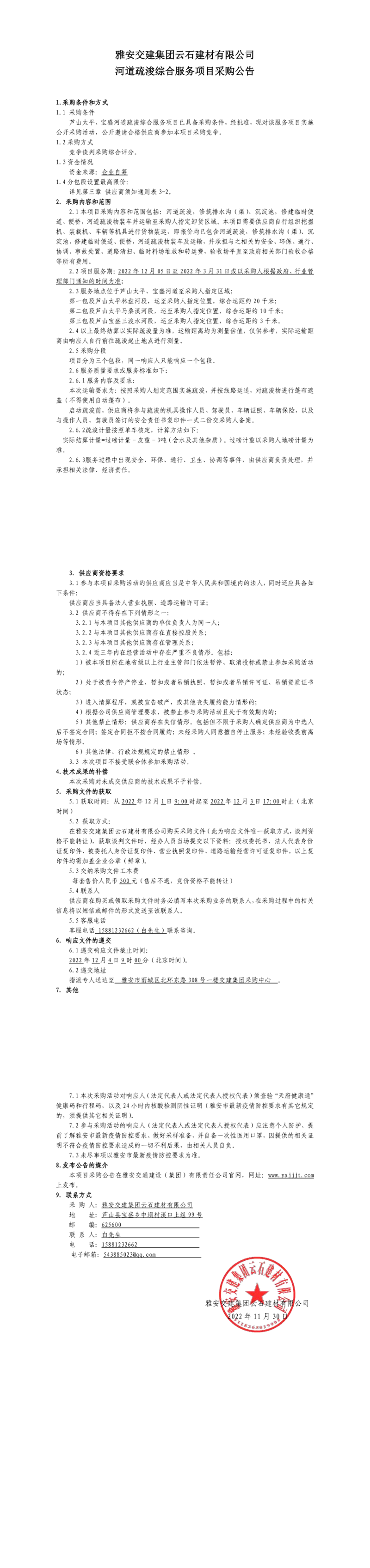 雅安交建集團(tuán)云石建材有限公司河道疏浚綜合服務(wù)項目采購公告