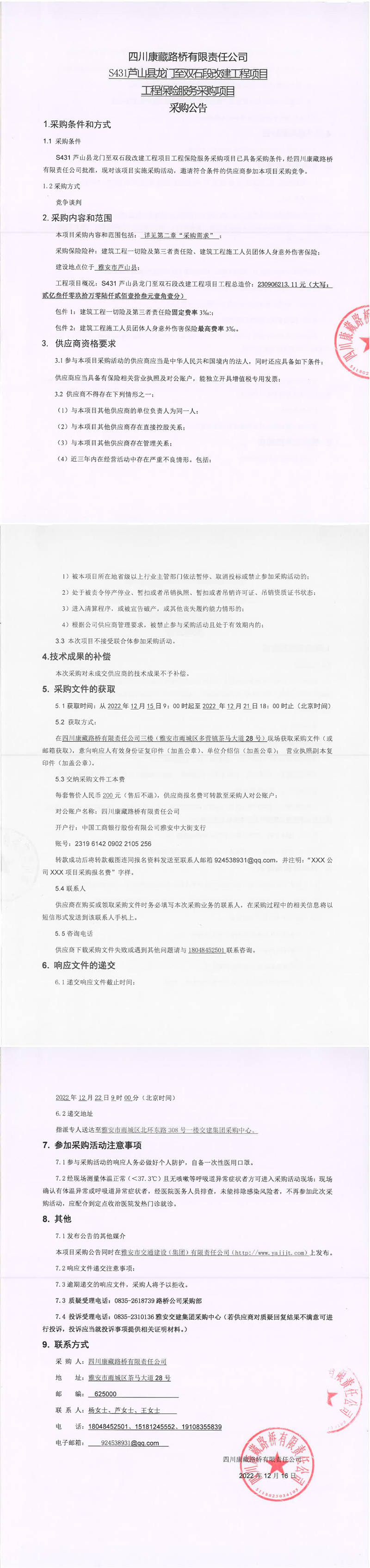 四川康藏路橋有限責(zé)任公司S431蘆山縣龍門(mén)至雙石段改建工程項(xiàng)目工程保險(xiǎn)服務(wù)采購(gòu)項(xiàng)目采購(gòu)公告