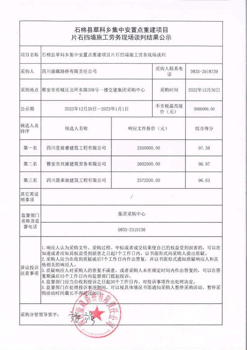 四川康藏路橋有限責(zé)任公司石棉縣草科鄉(xiāng)集中安置點重建項目片石擋墻施工勞務(wù)現(xiàn)場談判結(jié)果公示