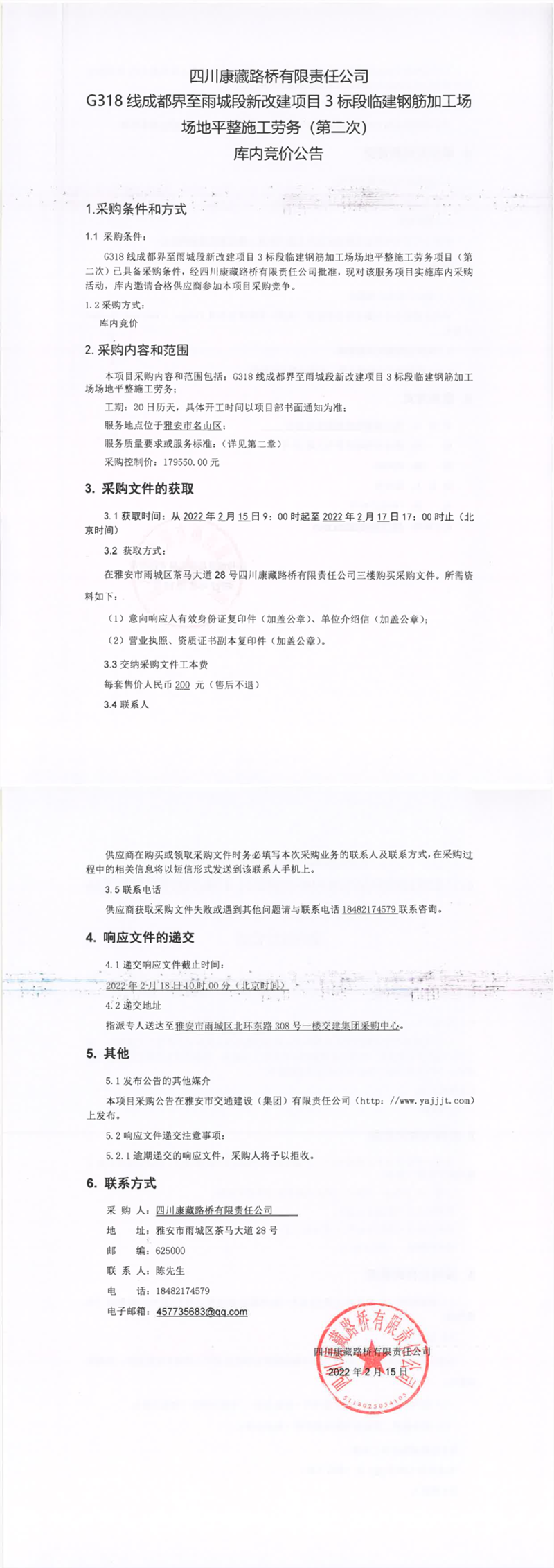 四川康藏路橋有限責(zé)任公司G318線成都界至雨城段新改建項(xiàng)目3標(biāo)段臨建鋼筋加工場(chǎng)場(chǎng)地平整施工勞務(wù)(第二次)庫內(nèi)競(jìng)價(jià)公告