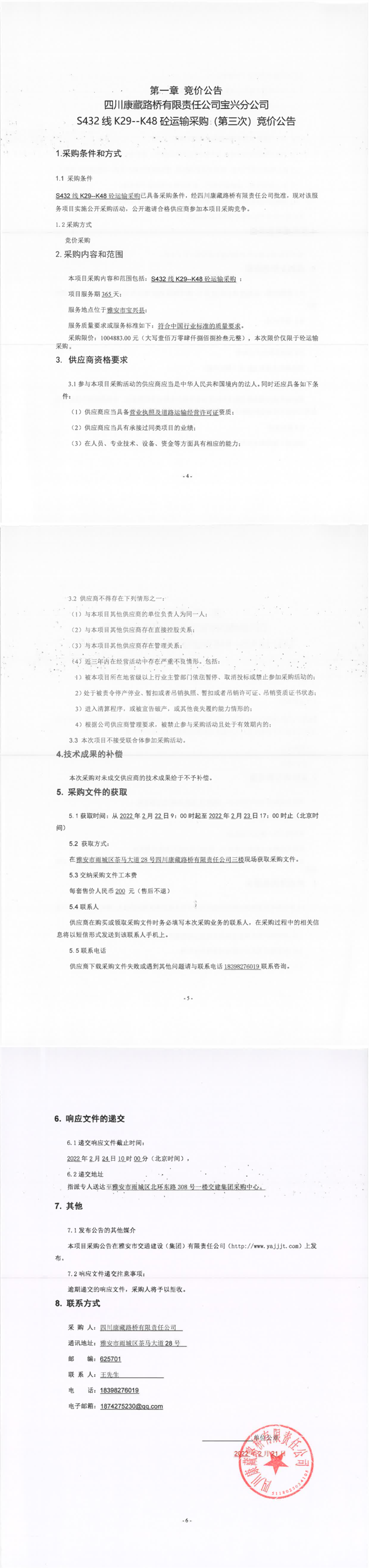 四川康藏路橋有限責(zé)任公司寶興分公司S432線K29-K48砼運輸采購(第三次)競價公告