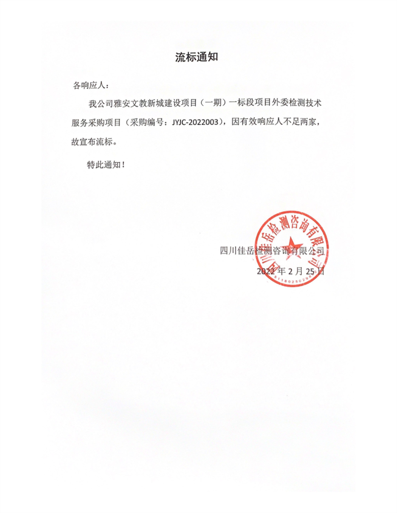 四川佳岳檢測(cè)咨詢(xún)有限公司雅安文教新城建設(shè)項(xiàng)目(一期)一標(biāo)段項(xiàng)目外委檢測(cè)技術(shù)服務(wù)采購(gòu)項(xiàng)目流標(biāo)通知
