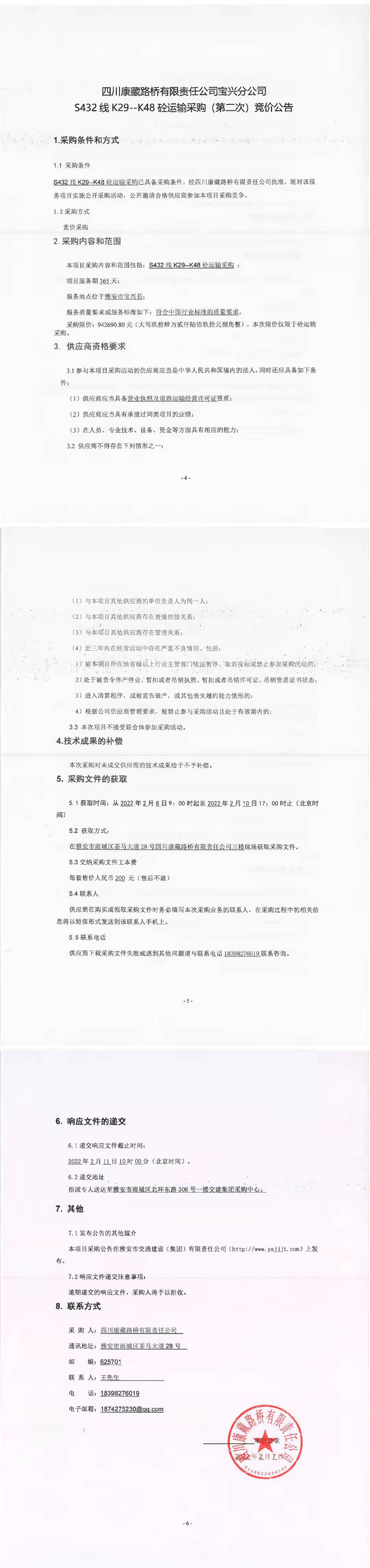 四川康藏路橋有限責(zé)任公司寶興分公司S432線K29-K48砼運(yùn)輸采購(gòu)(第二次)競(jìng)價(jià)公告