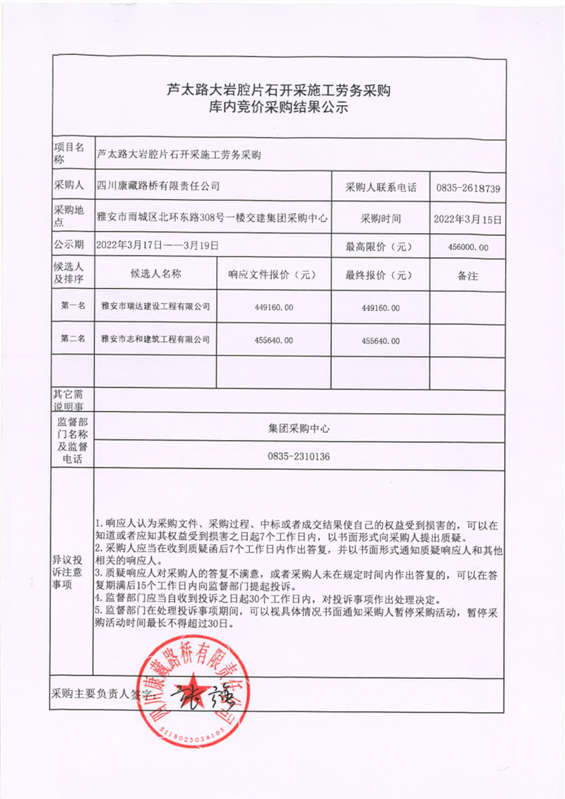 四川康藏路橋有限責(zé)任公司蘆太路大巖腔片石開(kāi)采施工勞務(wù)采購(gòu)庫(kù)內(nèi)競(jìng)價(jià)采購(gòu)結(jié)果公示
