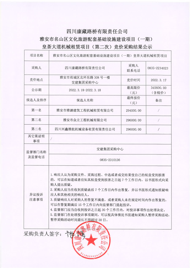 四川康藏路橋有限責(zé)任公司雅安市名山區(qū)文化旅游配套基礎(chǔ)設(shè)施建設(shè)項(xiàng)目(一期)皇茶大道機(jī)械租賃項(xiàng)目(第二次)競價采購結(jié)果公示