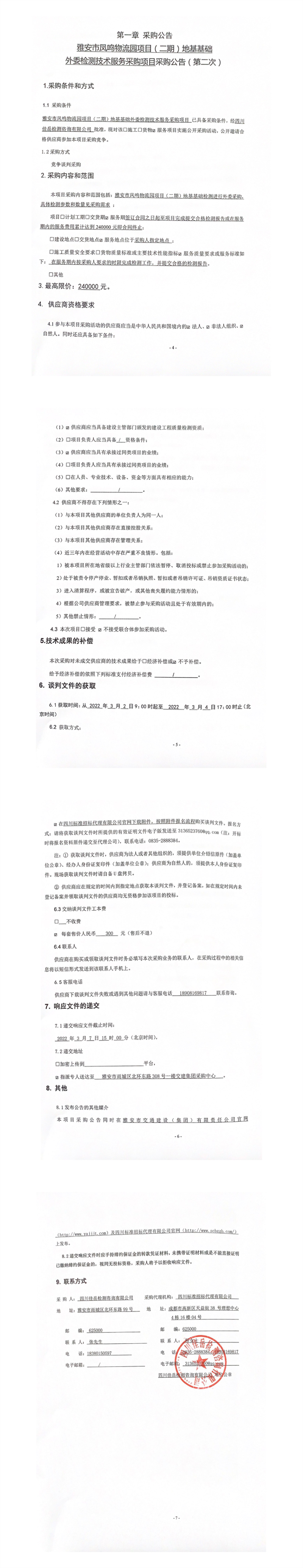 四川佳岳檢測咨詢有限公司雅安市鳳鳴物流園項目(二期)地基基礎(chǔ)外委檢測技術(shù)服務(wù)采購項目采購公告(第二次)