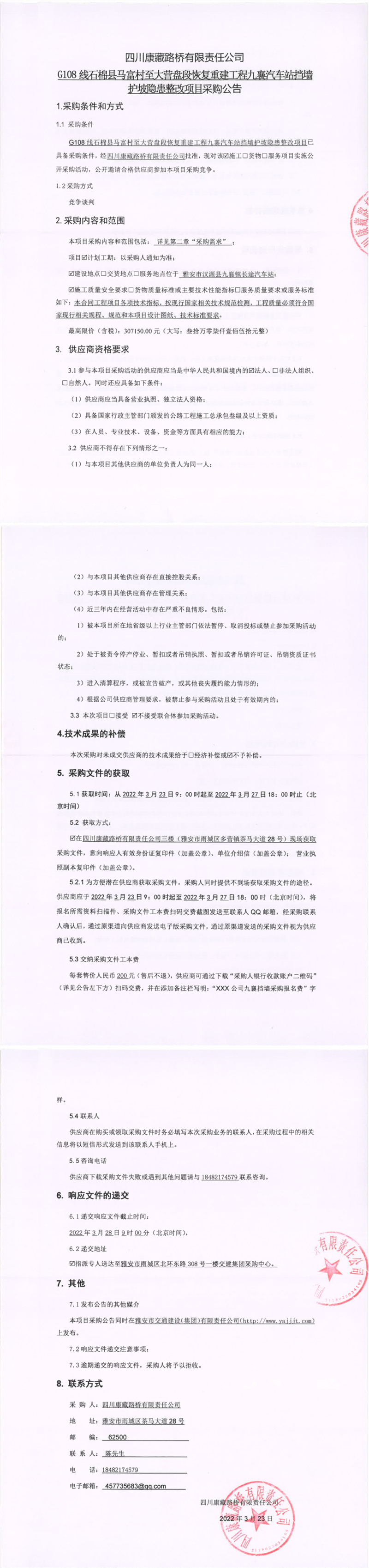 四川康藏路橋有限責任公司G108線石棉縣馬福村至大營盤段恢復重建工程九襄汽車站擋墻護坡隱患整改項目采購公告