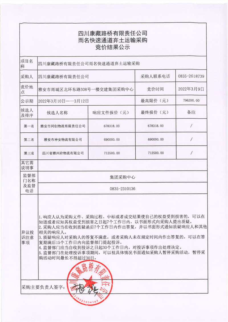 四川康藏路橋有限責(zé)任公司雨名快速通道棄土運(yùn)輸采購(gòu)競(jìng)價(jià)結(jié)果公示