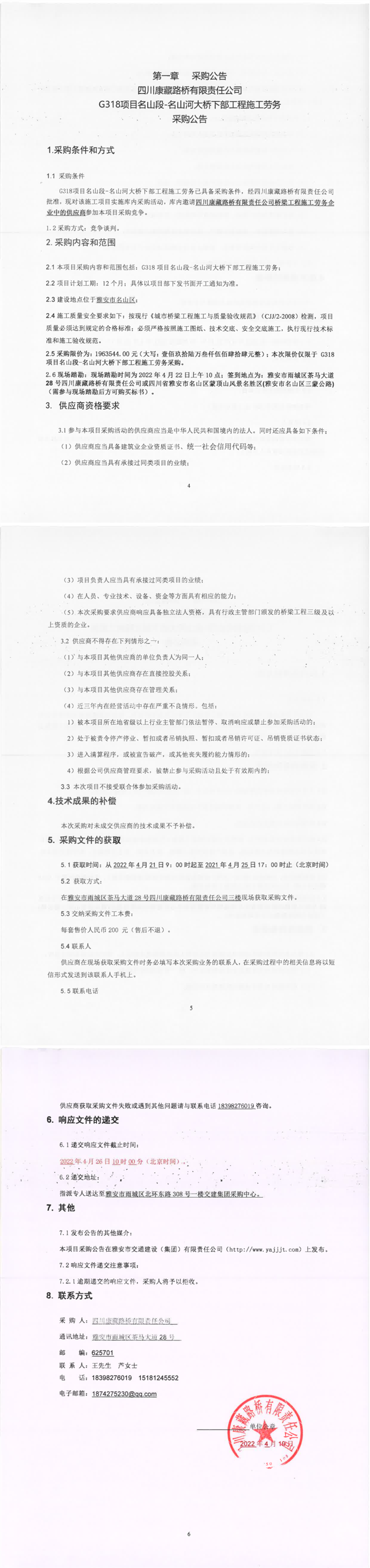 四川康藏路橋有限責任公司G318項目名山段-名山河大橋下部工程施工勞務(wù)采購公告