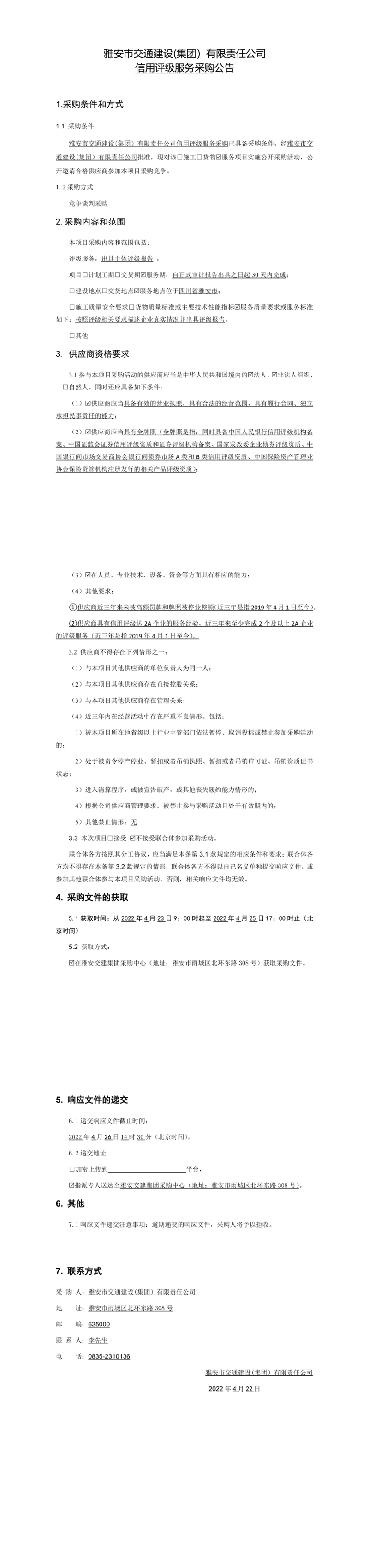 雅安市交通建設(集團)有限責任公司信用評級服務采購公告