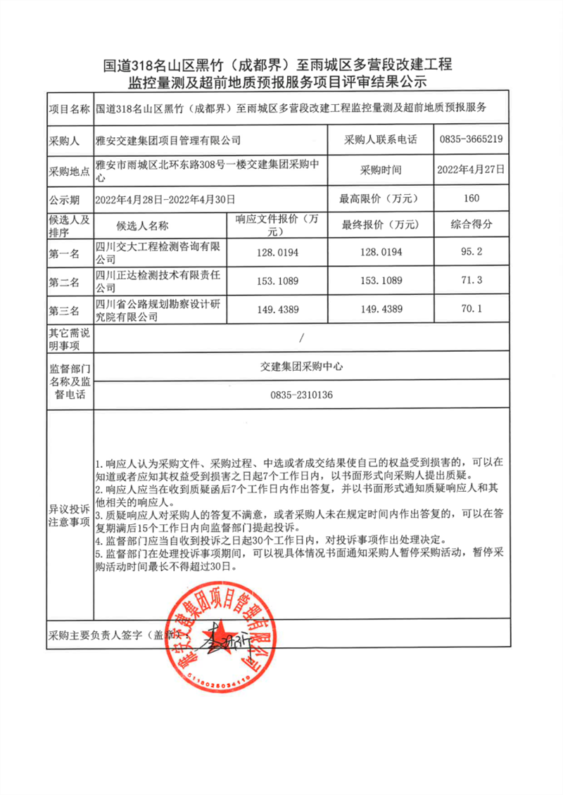 雅安交建集團項目管理有限公司國道318名山區(qū)黑竹(成都界)至雨城區(qū)多營段改建工程監(jiān)控量測及超前地質(zhì)預報服務項目評審結(jié)果公示