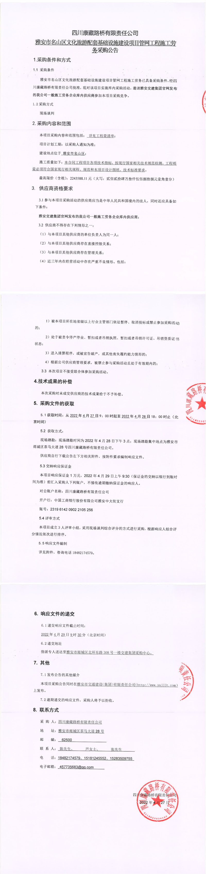 四川康藏路橋有限責(zé)任公司雅安市名山區(qū)文化旅游配套基礎(chǔ)設(shè)施建設(shè)項(xiàng)目管網(wǎng)工程施工勞務(wù)采購公告