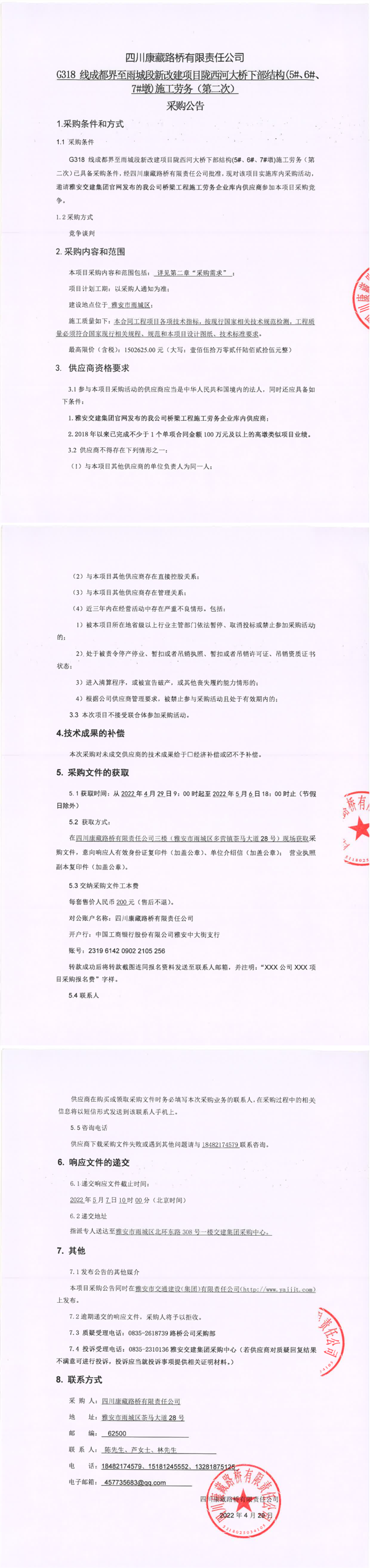 四川康藏路橋有限責(zé)任公司G318線成都界至雨城段新改建項(xiàng)目隴西河大橋下部結(jié)構(gòu)(5#、6#、7#墩)施工勞務(wù)(第二次)采購公告