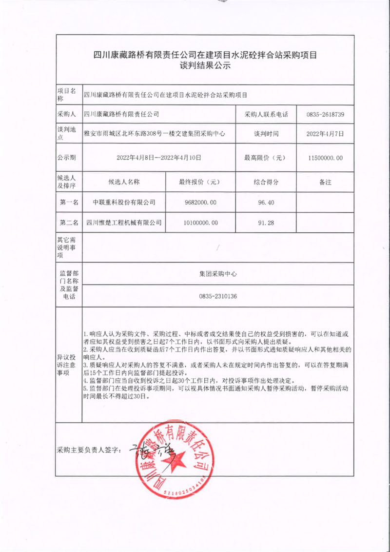 四川康藏路橋有限責任公司在建項目水泥砼拌合站采購項目談判結果公示