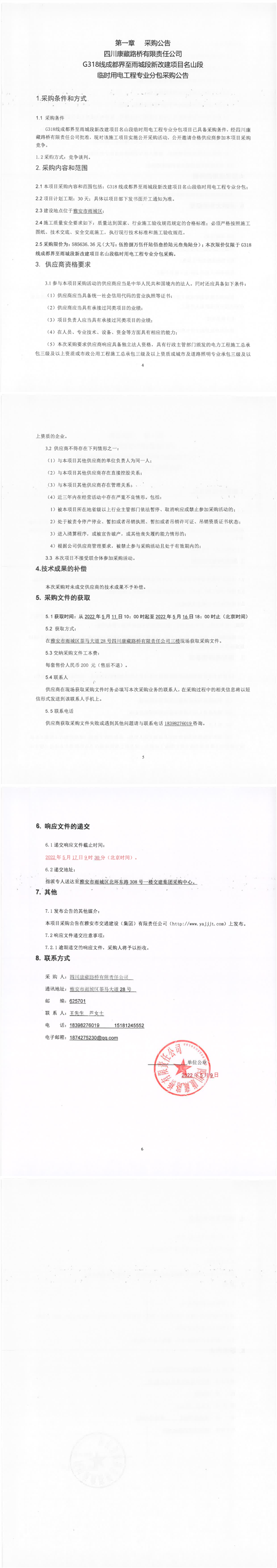 四川康藏路橋有限責(zé)任公司G318線成都界至雨城段新改建項(xiàng)目名山段臨時用電工程專業(yè)分包采購公告