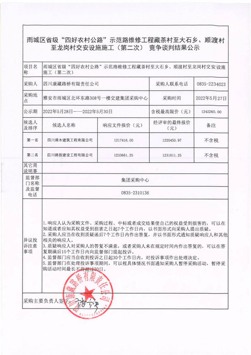 四川康藏路橋有限責任公司雨城區(qū)省級“四好農(nóng)村公路”示范路維修工程藏茶村至大石鄉(xiāng)、順渡村至龍崗村交安設施施工(第二次)競爭談判結(jié)果公示
