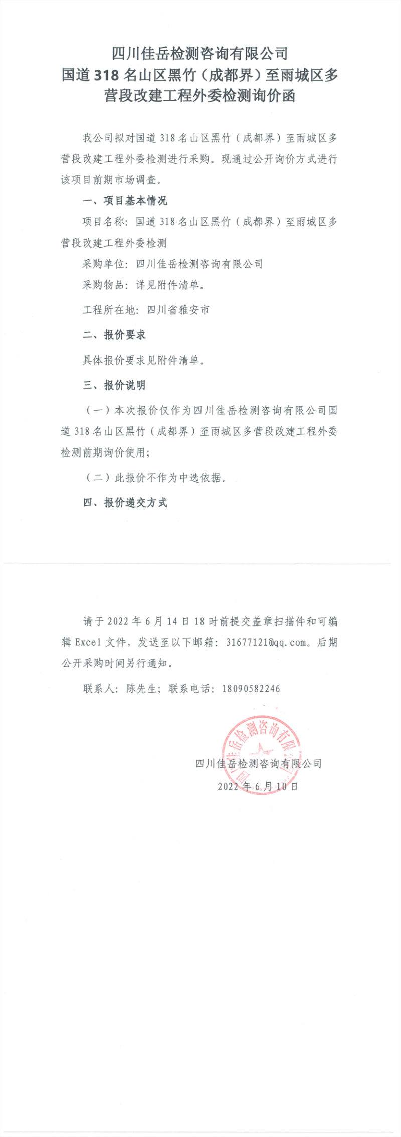 四川佳岳檢測(cè)咨詢有限公司國道318名山區(qū)黑竹(成都界)至雨城區(qū)多營段改建工程外委檢測(cè)詢價(jià)函