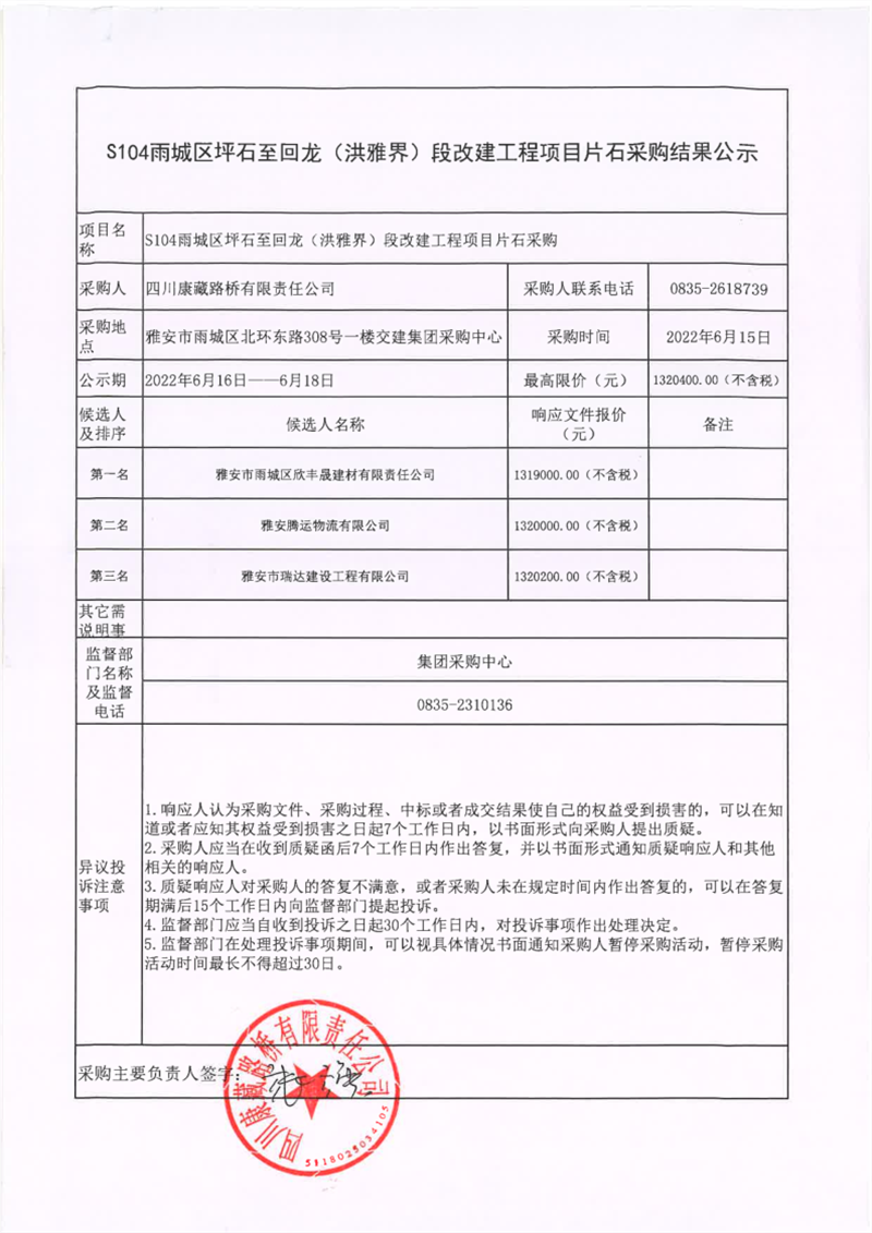 四川康藏路橋有限責任公司S104雨城區(qū)坪石至回龍(洪雅界)段改建工程項目片石采購結果公示