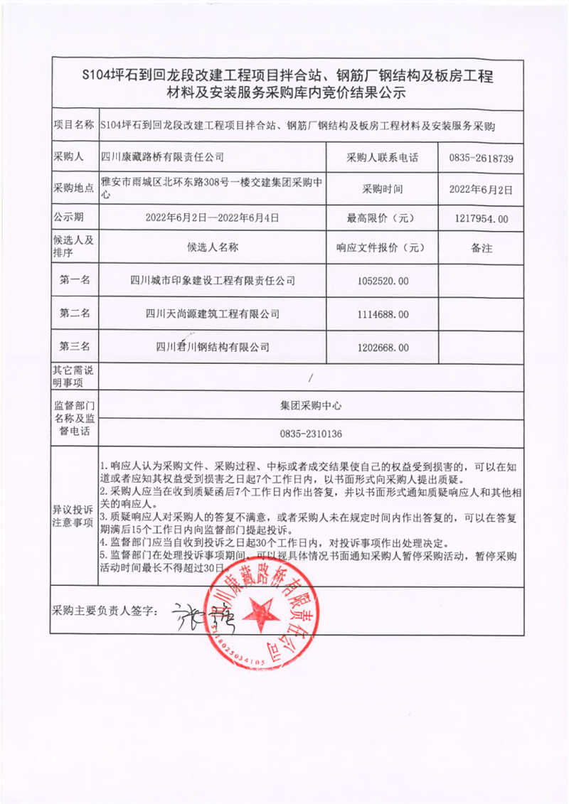 四川康藏路橋有限責(zé)任公司S104坪石到回龍段改建工程項(xiàng)目拌合站、鋼筋廠鋼結(jié)構(gòu)及板房工程材料及安裝服務(wù)庫內(nèi)競價(jià)結(jié)果公示